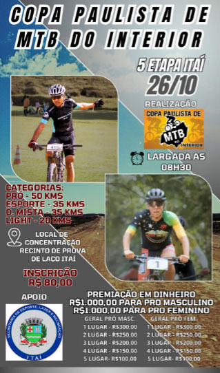 Sub 30 - até 29 anos; Andrey Bernardo da Silva dos Santos - Avulso - Itaí SP Bernardo de Oliveira de Camargo - Avulso - Itararé SP Frederico Fróes - IN Bikes - Buri SP Guilherme Rodrigues de Souza - taquari bike shop - Taquarituba SP João Emanuel Santos - Corneteiros - Itapetininga SP João Vitor de Camargo - Epidemia Team AMCI - Itapetininga SP João Vitor Scalize Paixao - Avulso - Avaré SP Leone Gouveia Antunes Carraro - Epidemia Team AMCI - Buri SP Luis Eduardo Sala De Godoy - Itararé MTB Team - Itararé SP Marcos Dantas De Souzaa - Landes / Solifes - Ribeira SP Miguel Aramis Teodoro Machado - Avulso - Taquarituba SP Otavio Vinicius Coradi - Coradi Bike Shop - Manduri SP |